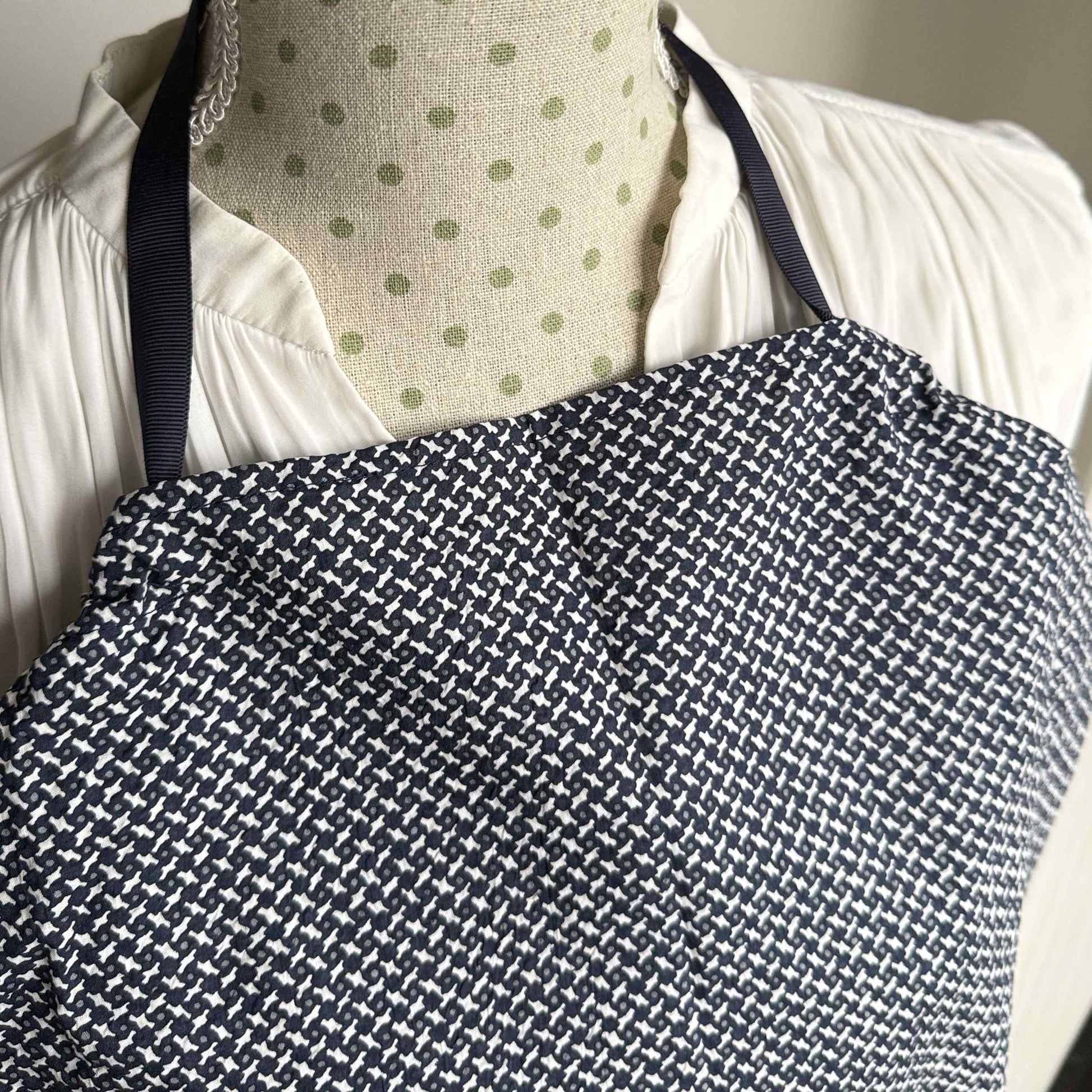 【着るハンカチ】「布帛の騎士」は、あらゆる食事シーンで洋服を食事の汚れから守る新エチケットアイテム。シックな小紋柄ネイビーが、フォーマルからビジネスまで幅広く対応します。